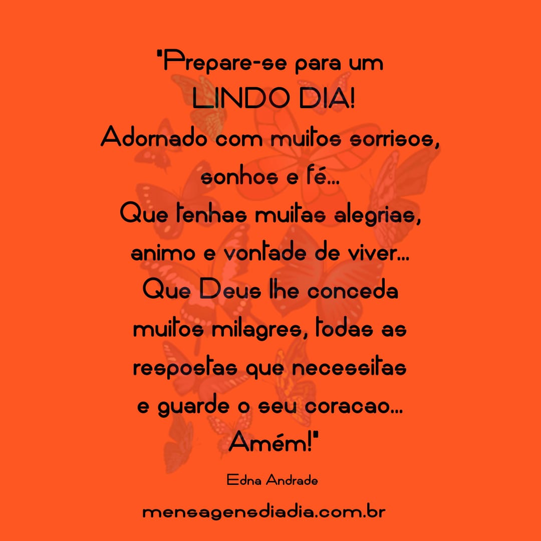 ” Prepare-se para um lindo dia! Adornado com muitos sorrisos, sonhos e fé….Que tenhas muita alegrias, ânimo e vontade de viver…Que Deus lhe conceda muitos