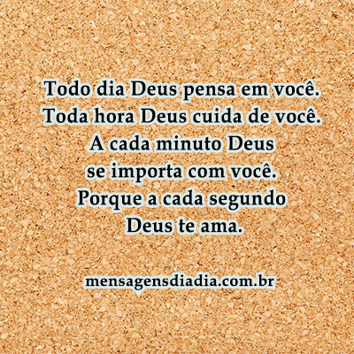 Todo dia Deus pensa em você. Toda hora Deus cuida de você. A cada minuto Deus se importa com você. Porque a cada segundo Deus