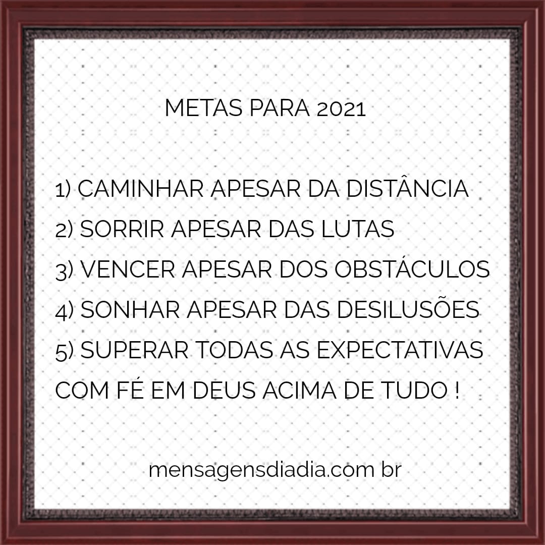 Metas para 2021 1- Caminhar apesar da distância 2- Sorrir apesar das lutas 3- Vencer apesar dos obstáculos 4- Sonhar apesar das desilusões 5- Superar