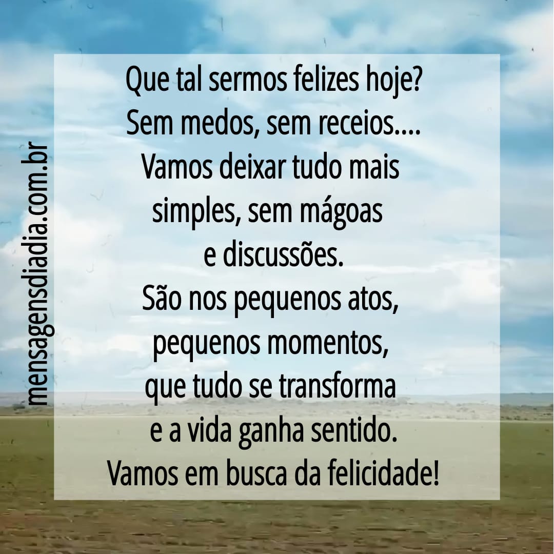 Que tal sermos felizes hoje? Sem medos, sem receios …. Vamos deixar tudo mais simples, sem mágoas e discussões. São nos pequenos atos, pequenos momentos