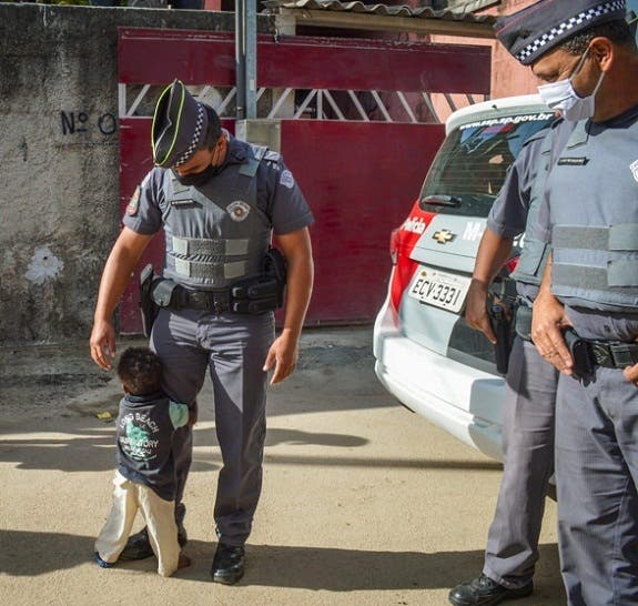 Os policiais militares, que entregavam donativos na periferia da cidade, não esperavam pelo carinhoso sinal de gratidão do garotinho. “Ficamos com aquela sensação de dever
