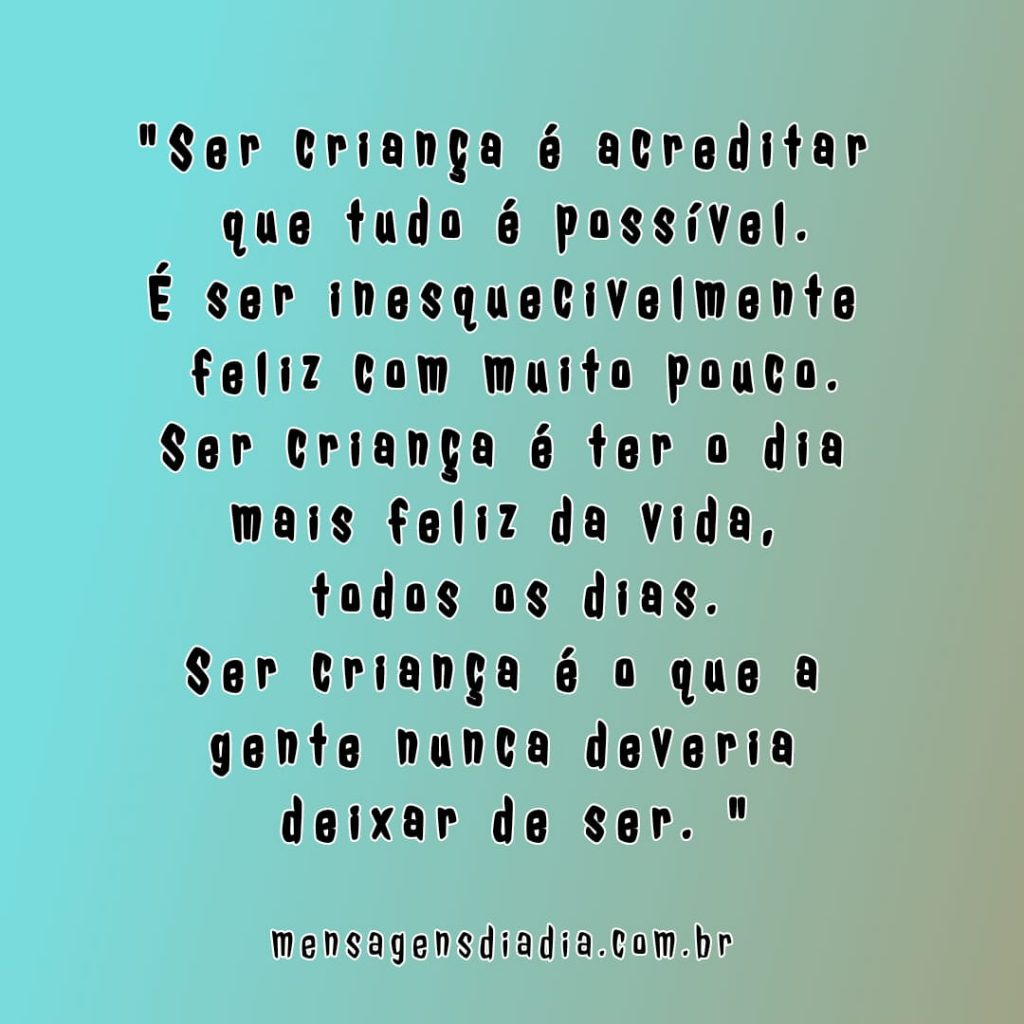 “Ser criança é acreditar que tudo é possível. É ser inesquecivelmente feliz com muito pouco. Ser criança é ter o dia mais feliz da vida, todos os dias. Ser criança é o que a gente nunca deveria deixar de ser.”