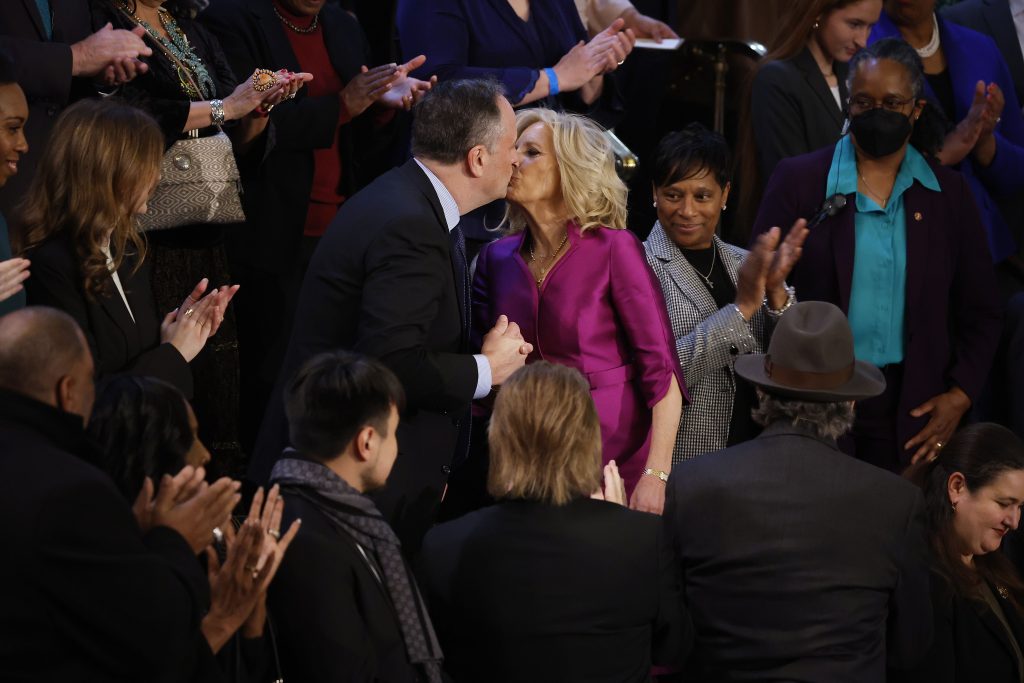 A primeira-dama dos Estados Unidos, Jill Biden, e o marido da vice-presidente Kamala Harris, Doug Emhoff, se cumprimentaram com um beijo na boca durante um evento no Congresso americano na terça-feira (7).