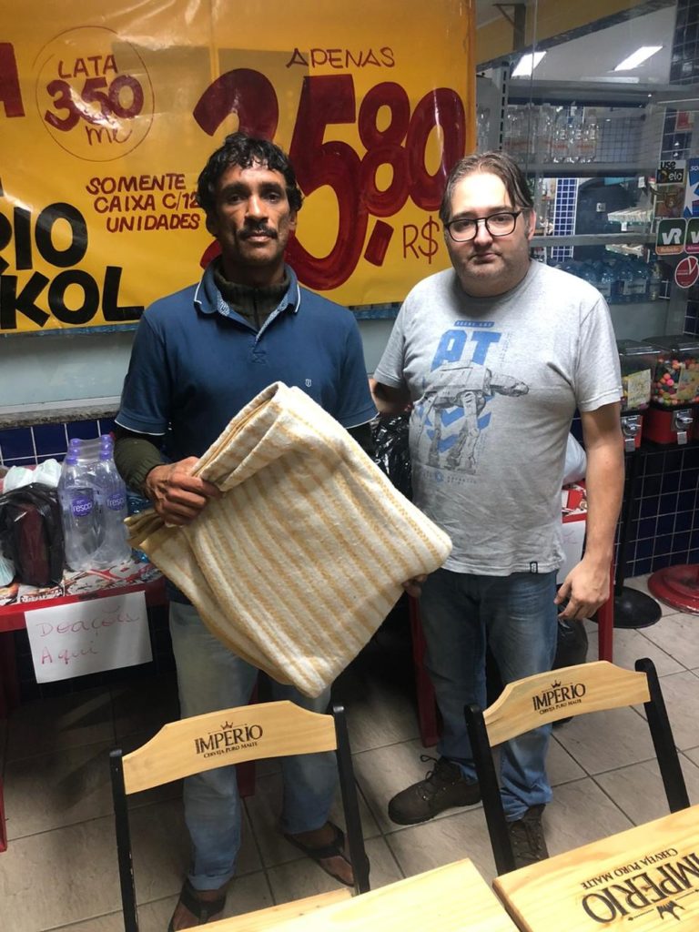 Francinaldo chegou enquanto a esposa do empresário preparava as doações. Disse que tinha ganhado três cobertores, mas que precisava somente de um e que gostaria de doar os demais.